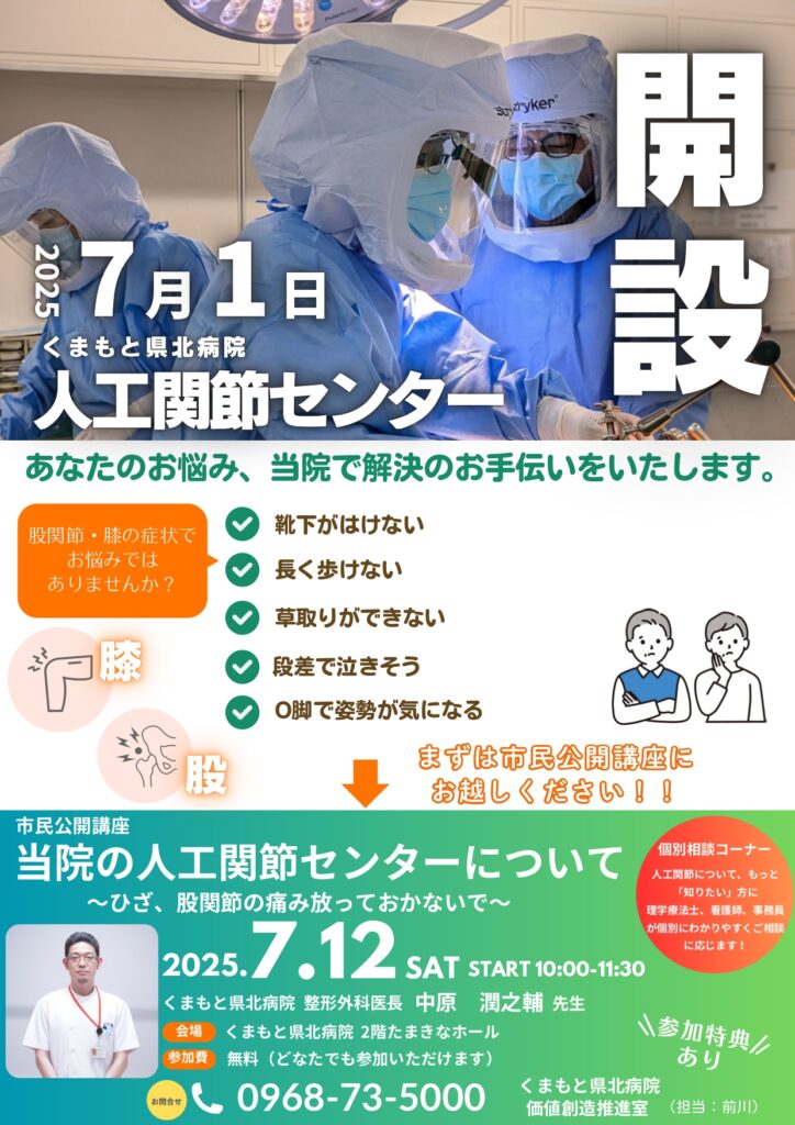 開催日時 2025年10月4日(土)10時00分~11時30分(9:30開場) 場所 くまもと県北病院2階 たまきなホール 内容 詳しくはこちら(JPEG) 7月のテーマは、「当院の人工関節センターについて ~ひざ、股関節の痛み放っておかないで~」